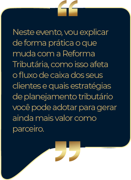 O evento foi cuidadosamente planejado para oferecer aos parceiros de Software ERP e Contadores um ambiente de aprendizado, troca estratégica e segurança diante das mudanças da Reforma Tributária. A verdade é que, a partir de agora, tanto os softwares de ERP quanto as contabilidade entrarão em um intenso processo de adaptação às novas exigências da Reforma Tributária. E não será apenas uma mudança pontual; ao longo de todo o ano de 2026, seus clientes buscarão respostas, orientações e soluções para cada dúvida e desafio que surgirem. Esse evento foi criado exatamente para isso: para oferecer o suporte e o conhecimento necessários, garantindo que você e sua equipe estejam sempre um passo à frente.